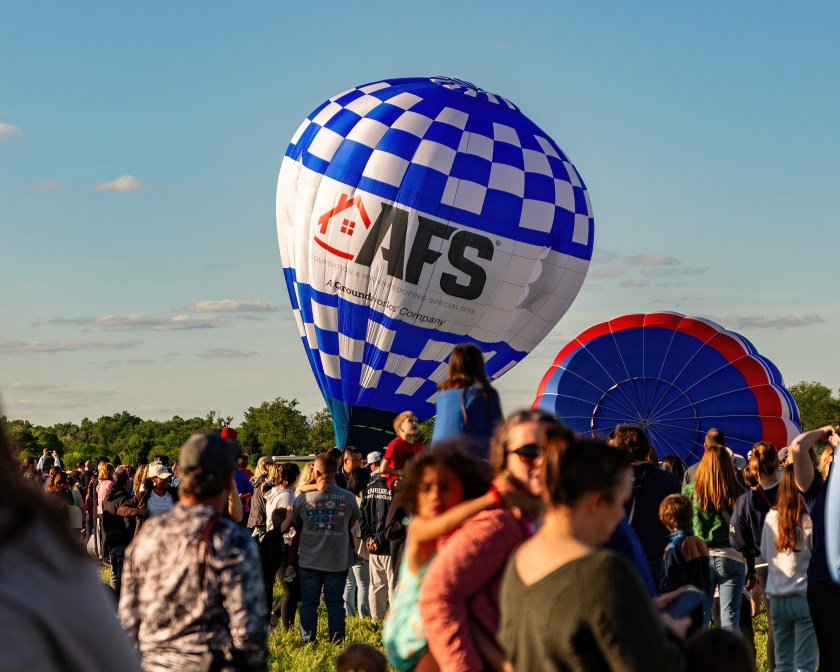 According to the KDF website, the race is set up as follows: “The Great Balloon Race is a Hare & Hound Race. This type of race is when all the balloons launch from the same site (Bowman Field). One balloon takes off first and is the Hare balloon. The other balloons are called the Hounds, and they will launch at a predetermined time after the Hare (usually 5 to 10 minutes after). The Hare lands at a suitable site and lays out a large fabric X, usually about 50 feet in diameter. The Hound balloons attempt to drop their markers as close to the center of the X as possible. The closest marker achieves the highest score.”